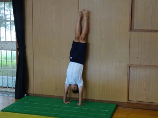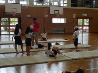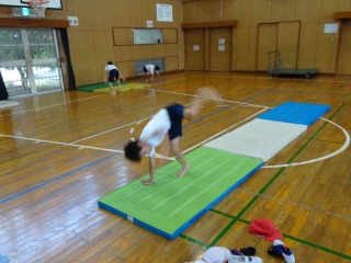 マット運動で、側転や倒立などの技を練習していました。