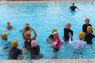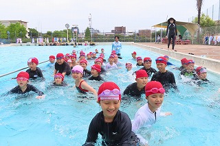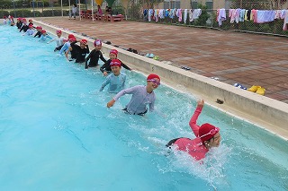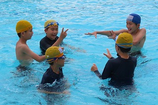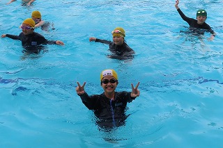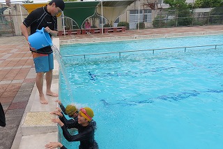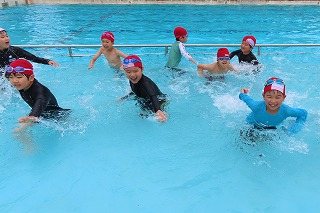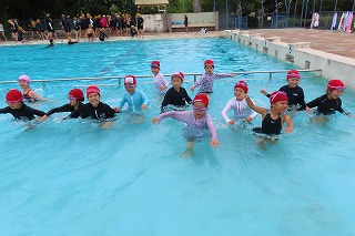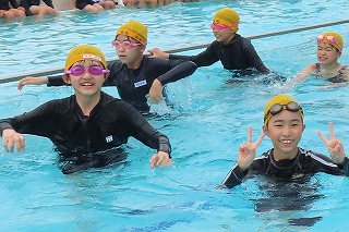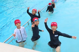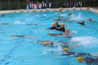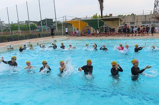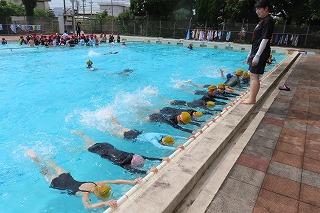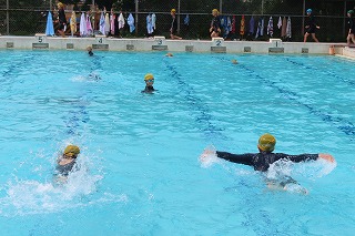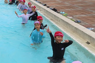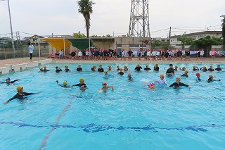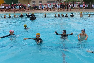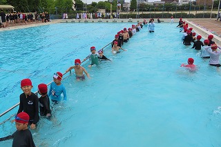 本日は、午前中に、なかよし・ほがらか学級(来客があり、見に行くことができませんでした・・)が、午後は、2年生と5年生が、実施をしました。午後は、途中、雨がパラパラもしましたが、水温が27度、気温は29度あり、「寒い」という児童も少しいましたが、概ね、気持ちよく実施できました。