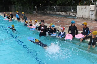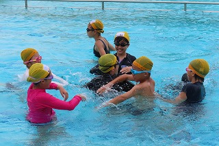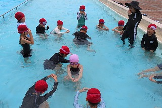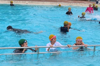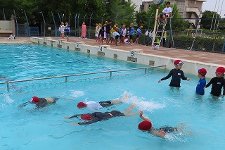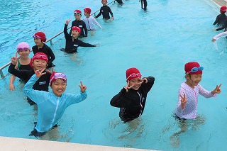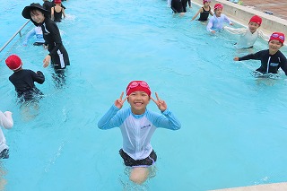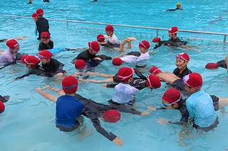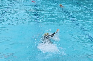 2年生-水慣れの後、顔を水につける練習と浮かぶ練習のコース別に分かれました。中には、もう泳げる子も。