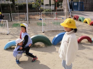 事前に申し込んだ2年生の児童が、半田幼稚園の園庭で一緒に遊びました。