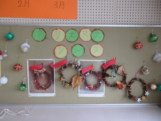 クリスマスリースが完成し、掲示や持ち帰りがされていました。
