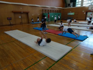 マット運動で、側転や倒立などの技を練習していました。