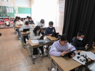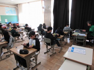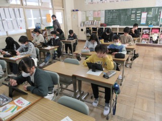 タブレット端末に出題された問題に真剣に取り組んでいました。