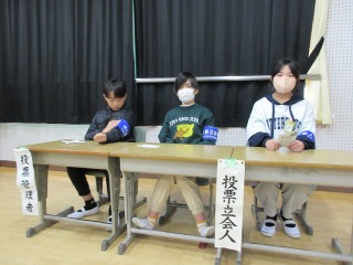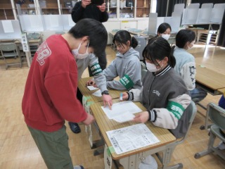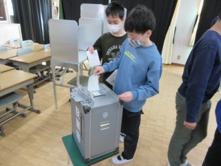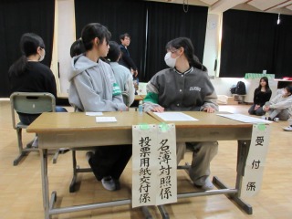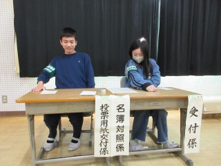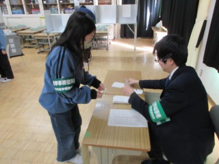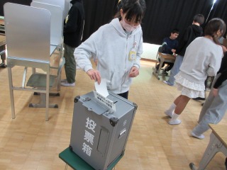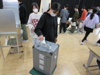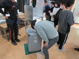 選挙に関する出前授業で講話を聞き、その後、投票の疑似体験をすることができました。