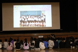 多くの児童は、学級で朝会の様子をモニター越しで見ました。