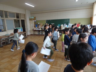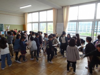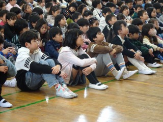 今日は、朝会前に、児童会によるクイズやじゃんけんがありました。