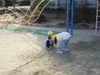 事前に申し込んだ2年生の児童が、半田幼稚園の園庭で一緒に遊びました。