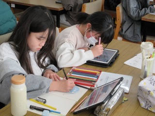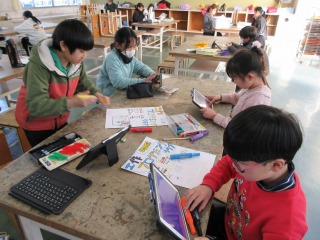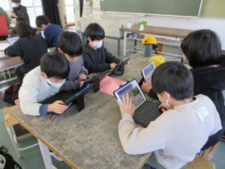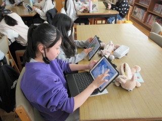 タブレット端末で作成したものを担任は確認したり、児童は話し合ったりしていました。