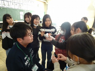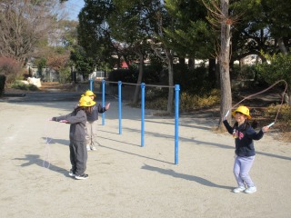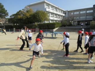 羽子板などで体の動かし方や福笑いで正しいやりとりもやります。